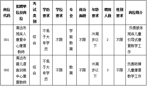 清遠市殘疾人康復中心、清遠市聾兒語言訓練中心,是市殘聯(lián)直屬公益一類事業(yè)單位,是專門為0-6歲殘障兒童康復的機構(gòu)。根據(jù)工作需要招聘康復教師5名(屬非編制人員,不列入用人單位編制序列,不擔任行政職務(wù)),現(xiàn)將有關(guān)事項公告如下: